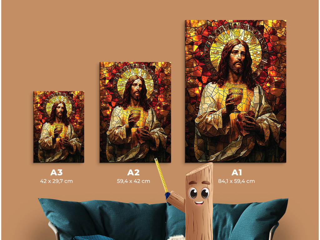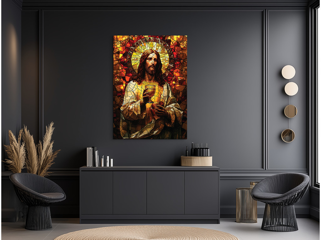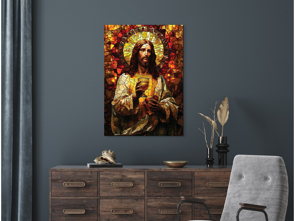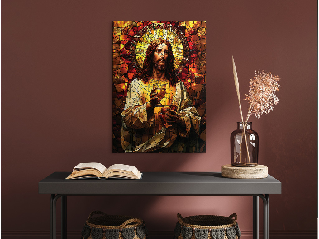 L'œuvre d'art représente Jésus-Christ dans le style d'un vitrail, tenant dans une main le calice et dans l'autre le pain, symboles de l'Eucharistie. Grâce à sa représentation colorée et sacrée, le tableau dégage une atmosphère spirituelle et solennelle, conférant à l'intérieur une ambiance paisible et recueillie.