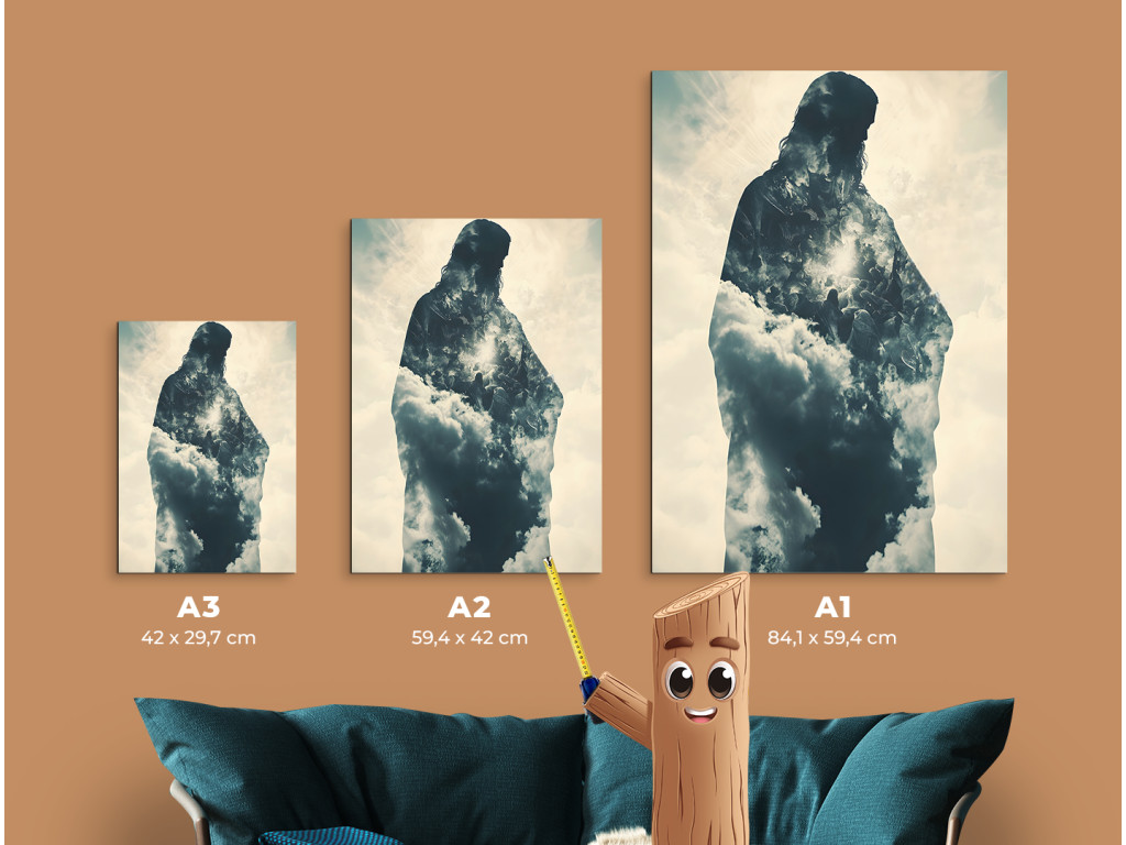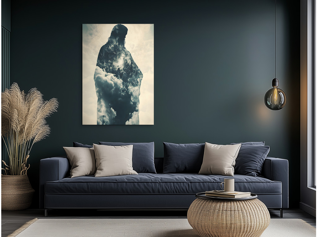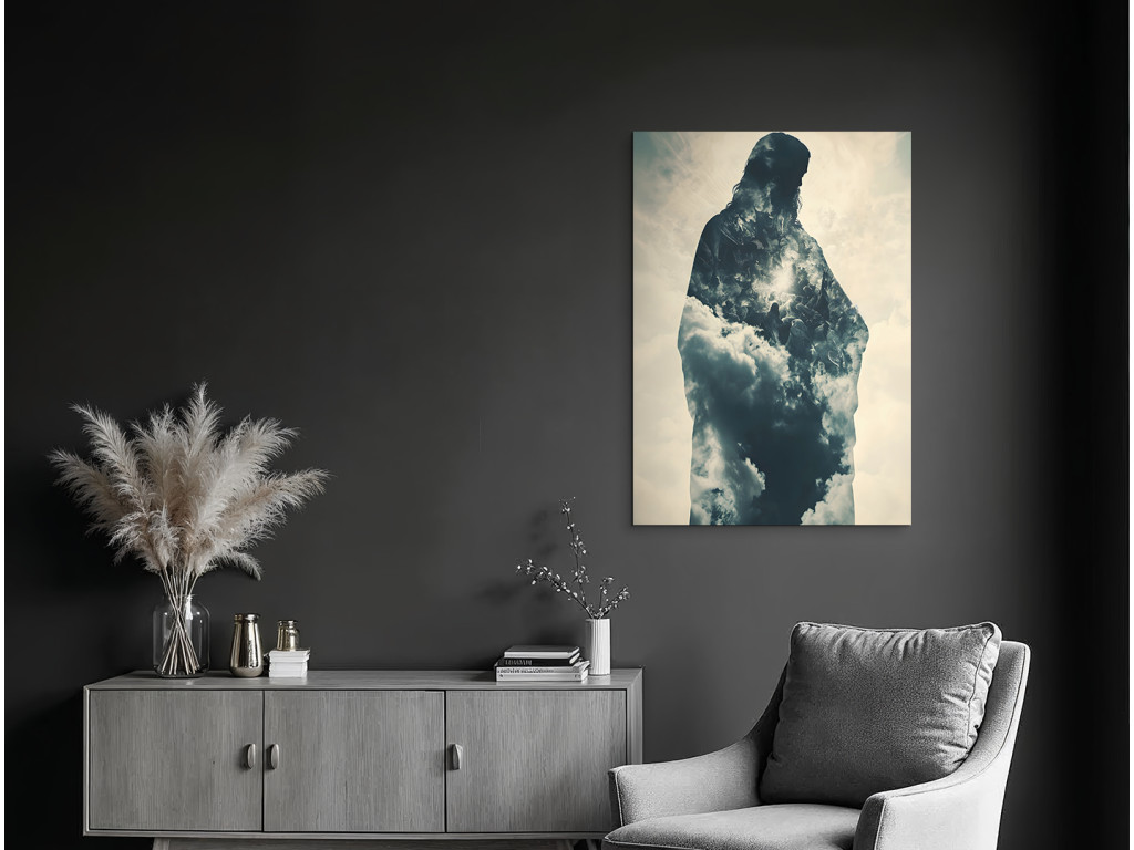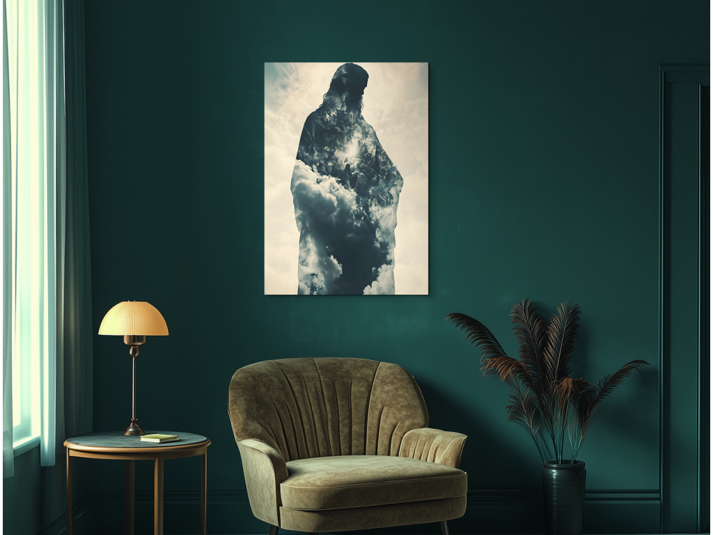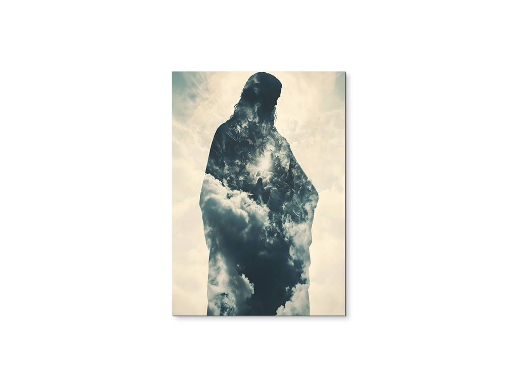 Ce tableau utilise la technique de la double exposition pour représenter la silhouette de Jésus-Christ, remplie d'un ciel nuageux. La combinaison d'une icône religieuse classique et d'un motif céleste crée une atmosphère spirituelle forte, dans laquelle la présence divine se marie à la poésie visuelle. Le résultat est une image qui incarne la paix, l'espoir et une vision contemporaine de la spiritualité.