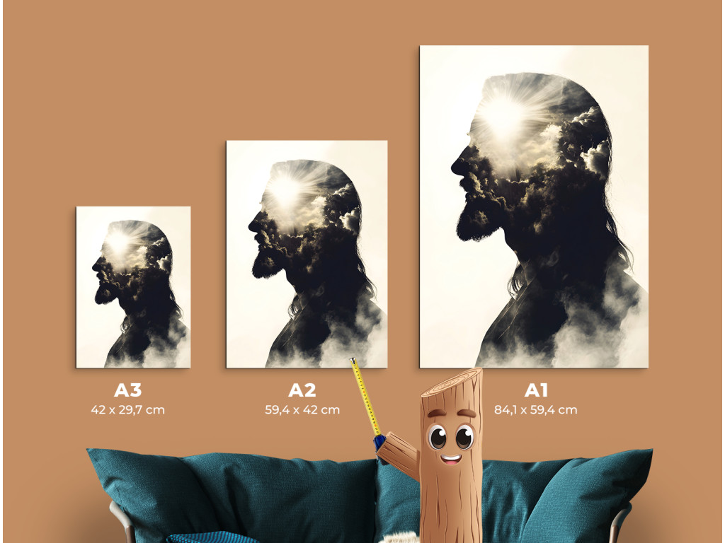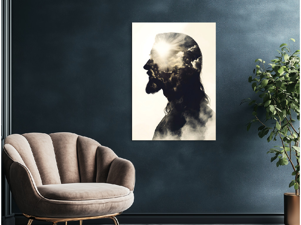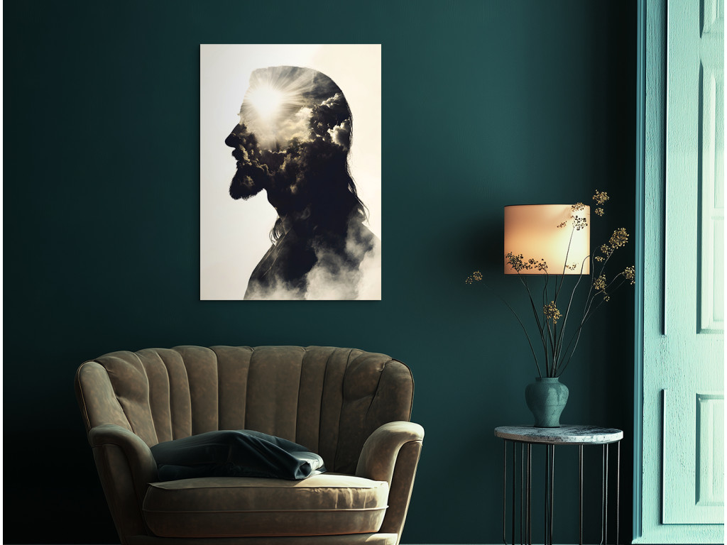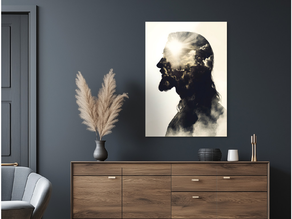 Le tableau représente la silhouette d'un homme aux traits caractéristiques rappelant Jésus-Christ : cheveux longs, barbe et profil serein. L'intérieur de la silhouette est rempli de nuages et de rayons de soleil, créant une forte impression de spiritualité et de paix céleste. La composition relie la forme humaine à la symbolique céleste, ouvrant ainsi un espace de contemplation de la foi et de la lumière.