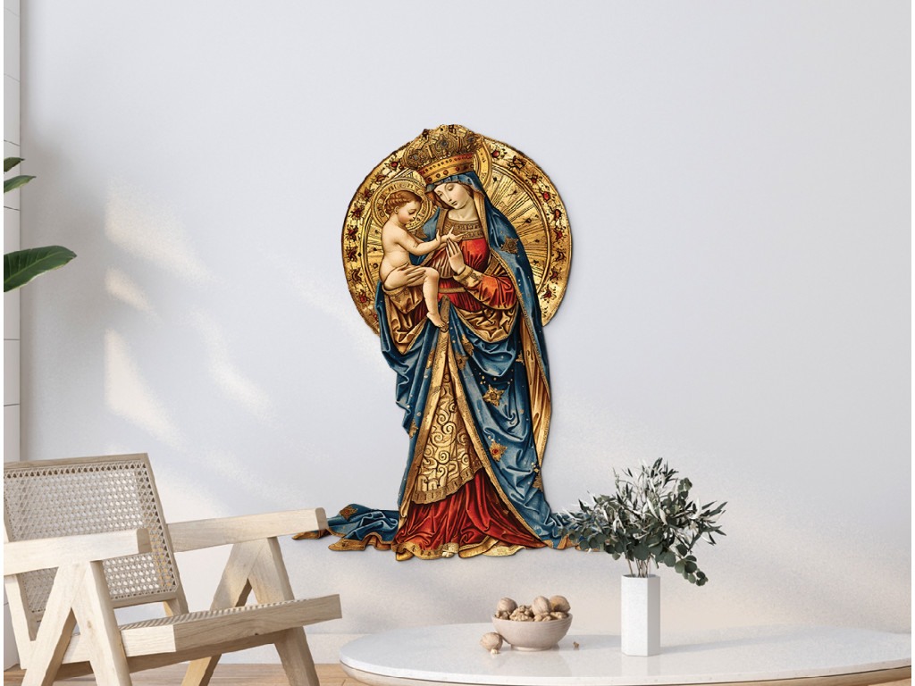 L'icône représente la figure de la Vierge Marie avec une couronne sur la tête, tenant l'enfant Jésus dans ses bras. L'ensemble de la représentation est décliné dans des tons dorés, ce qui souligne la grandeur spirituelle et l'origine divine des deux personnages. La couleur dorée symbolise la sainteté, l'éternité et la gloire céleste, tandis que la couronne sur la tête de Marie exprime son statut de Reine des Cieux. Ce type d'icône représente le culte classique de la Mère de Dieu comme source d'amour, de protection et d'espoir.