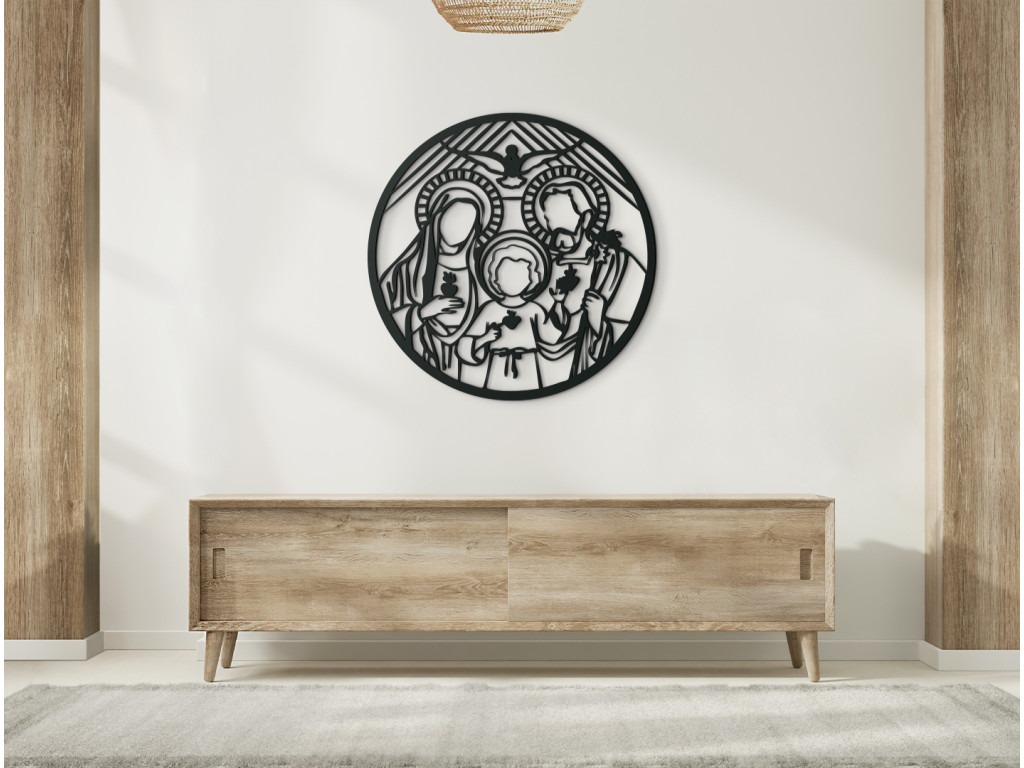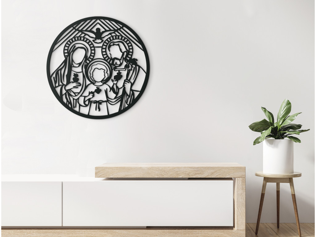 Drevený obraz Svätá rodina vnesie do interiéru pokojnú atmosféru. Vyobrazuje Jozefa a Máriu, medzi nimi aj Ježiška. Nad nimi sa rozlieha Duch Svätý. Drevený obraz svätej rodiny je vhodný na stenu do obývačky alebo spálne.