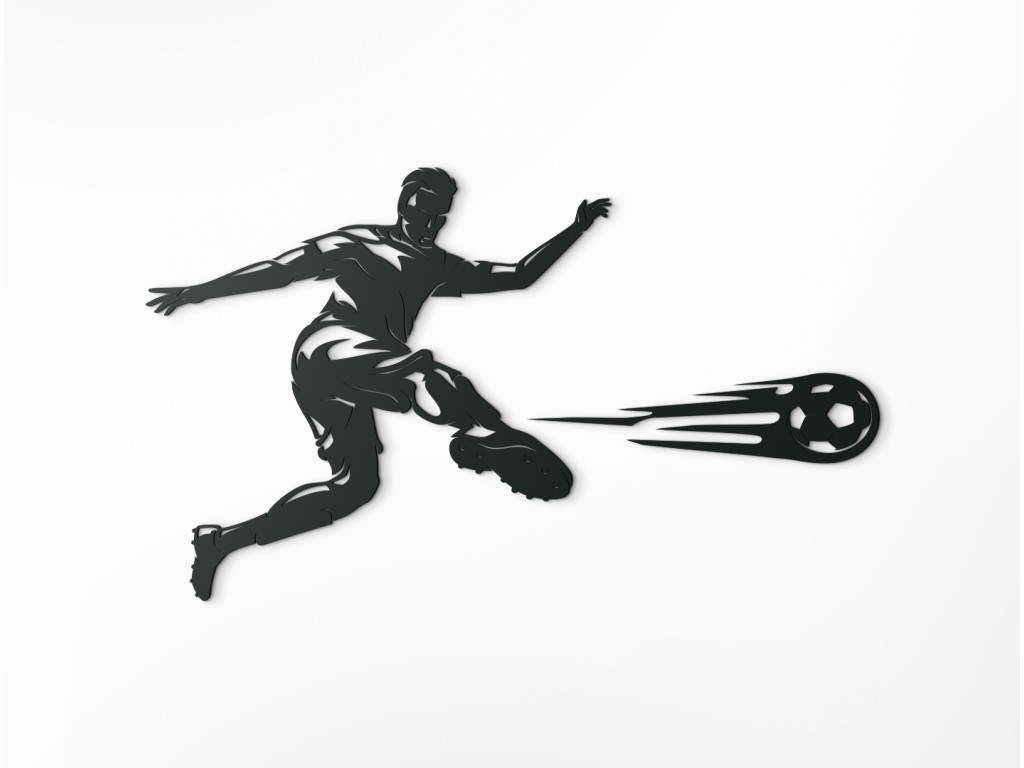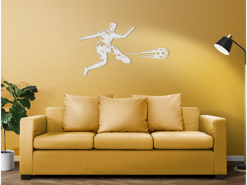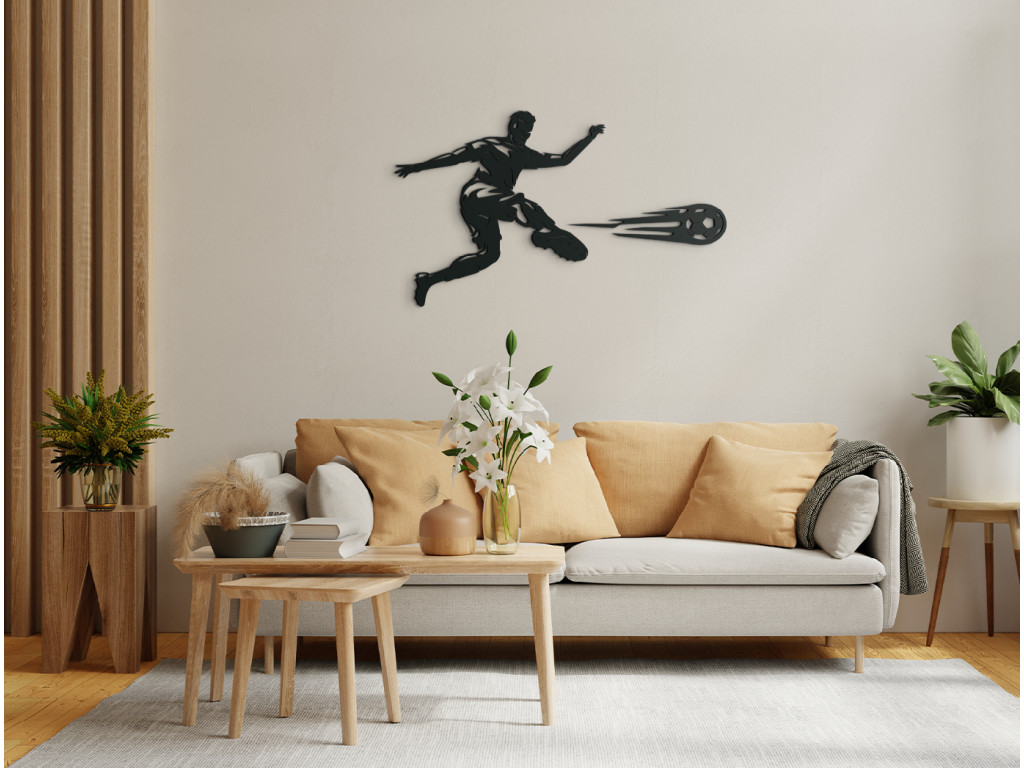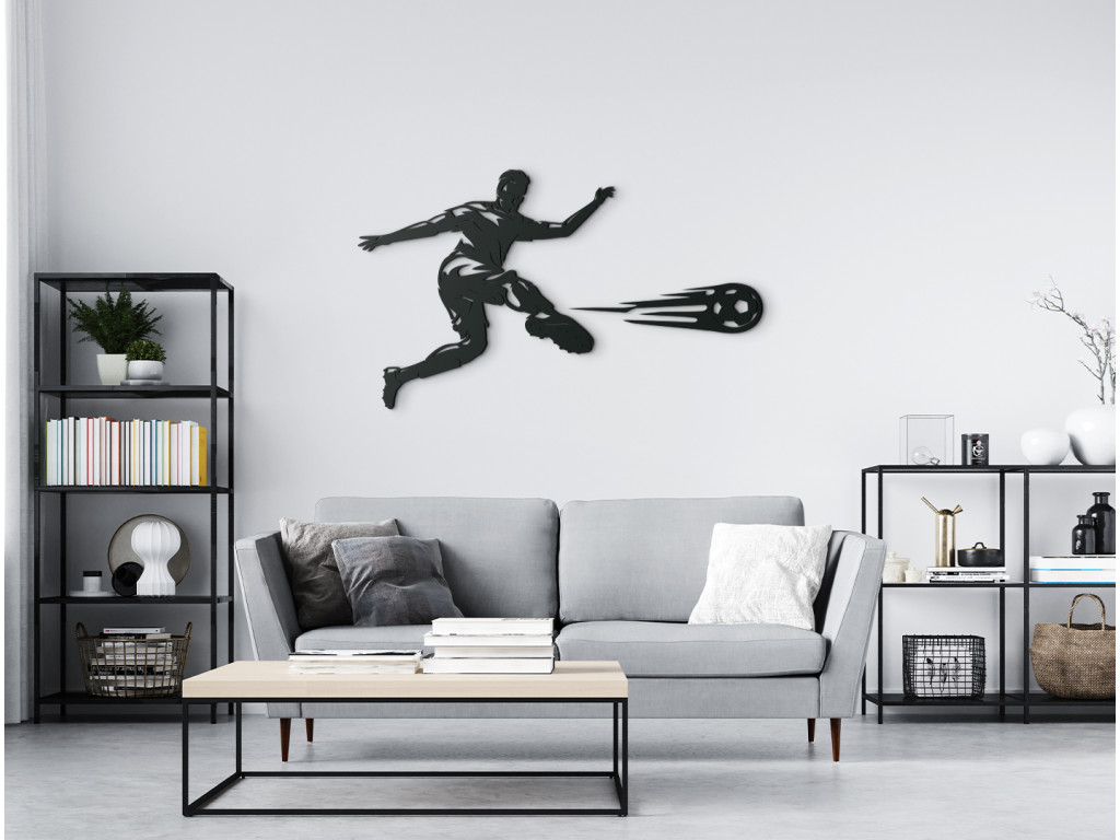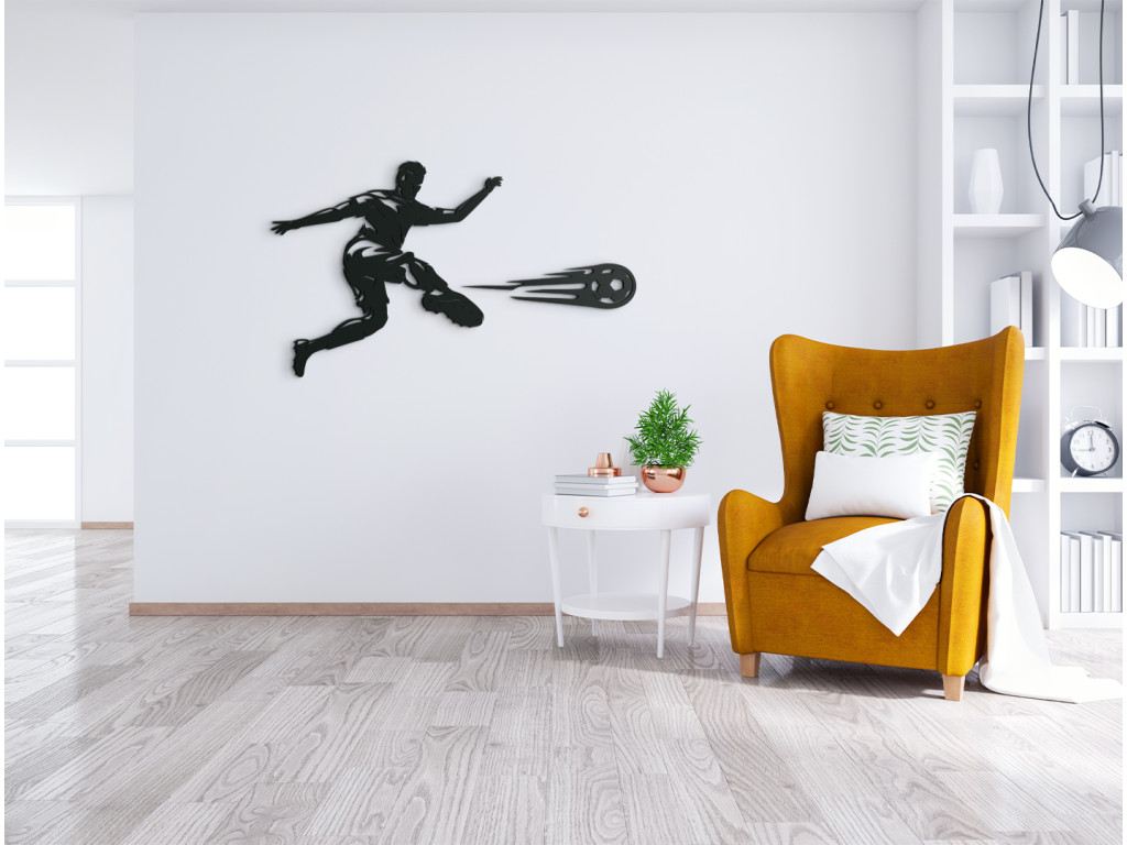 Pour tous les passionnés de football, nous proposons une décoration en bois représentant un footballeur en plein tir au but. Elle apportera une atmosphère sportive à votre intérieur. Idéale dans un intérieur moderne, elle peut être placée au-dessus d’un canapé, d’une commode ou d’un lit.
