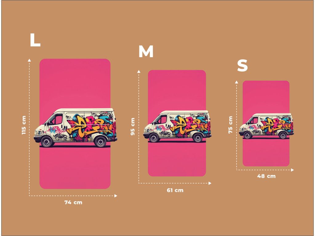 L'image représente une fourgonnette recouverte de graffitis colorés, placée sur un fond rectangulaire rose. Le design dynamique de style street art s'intègre parfaitement dans un décor moderne ou sur un emballage imprimé.