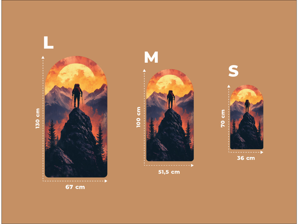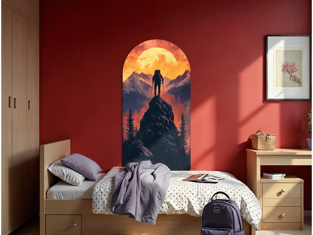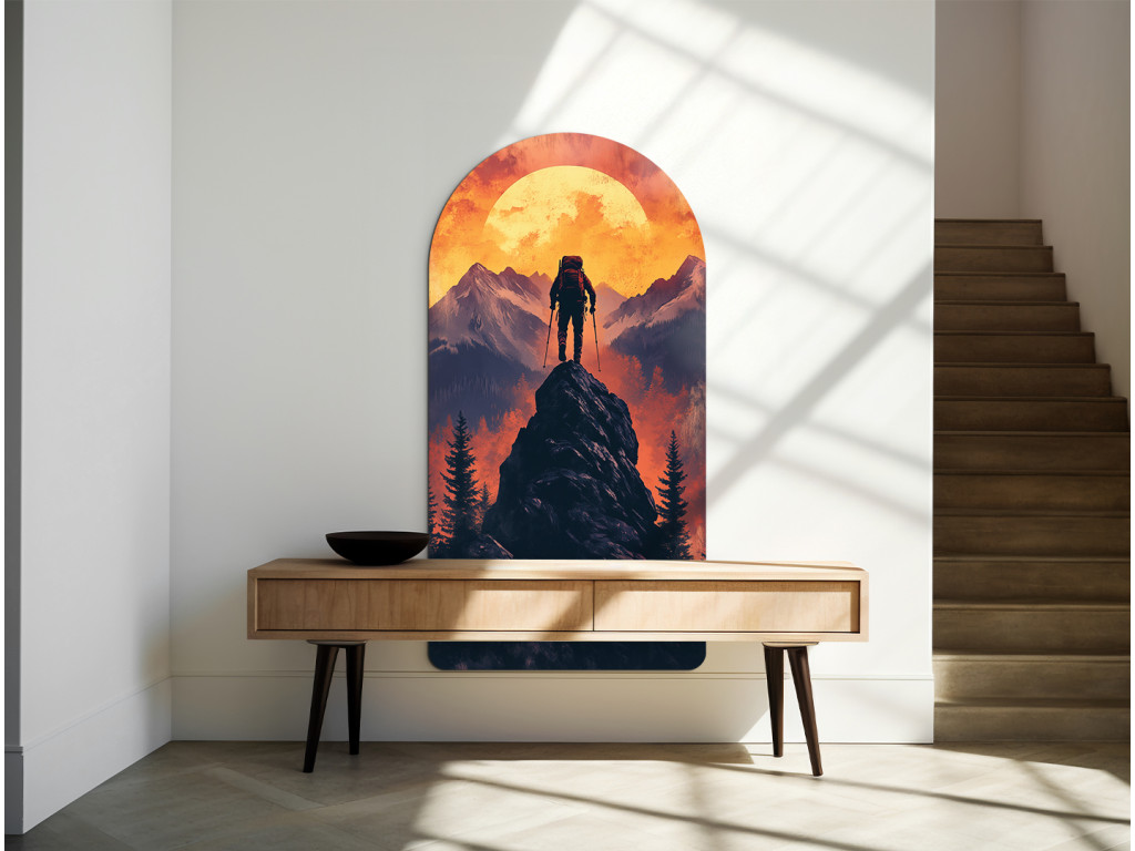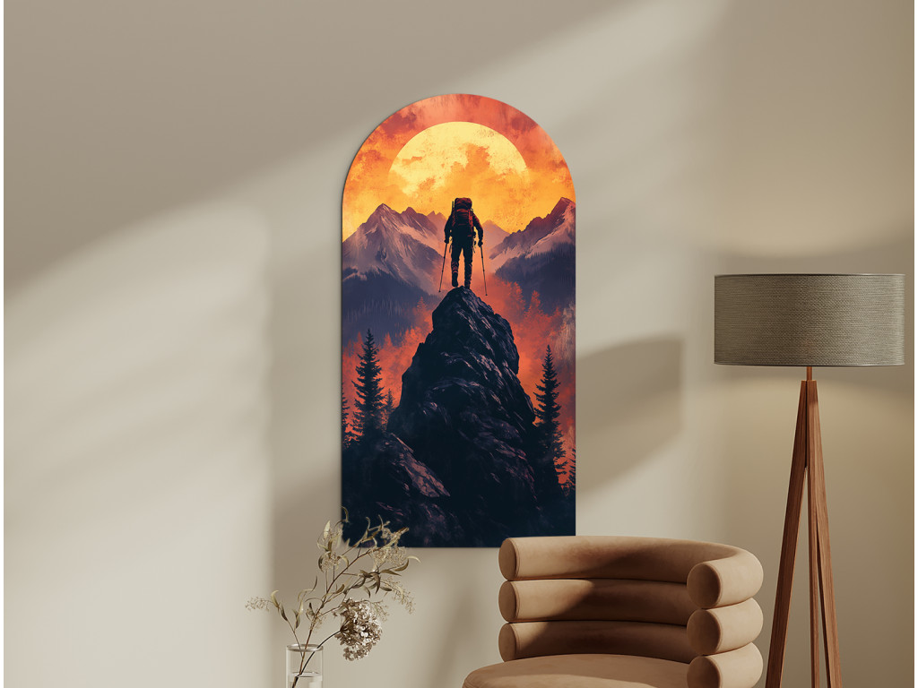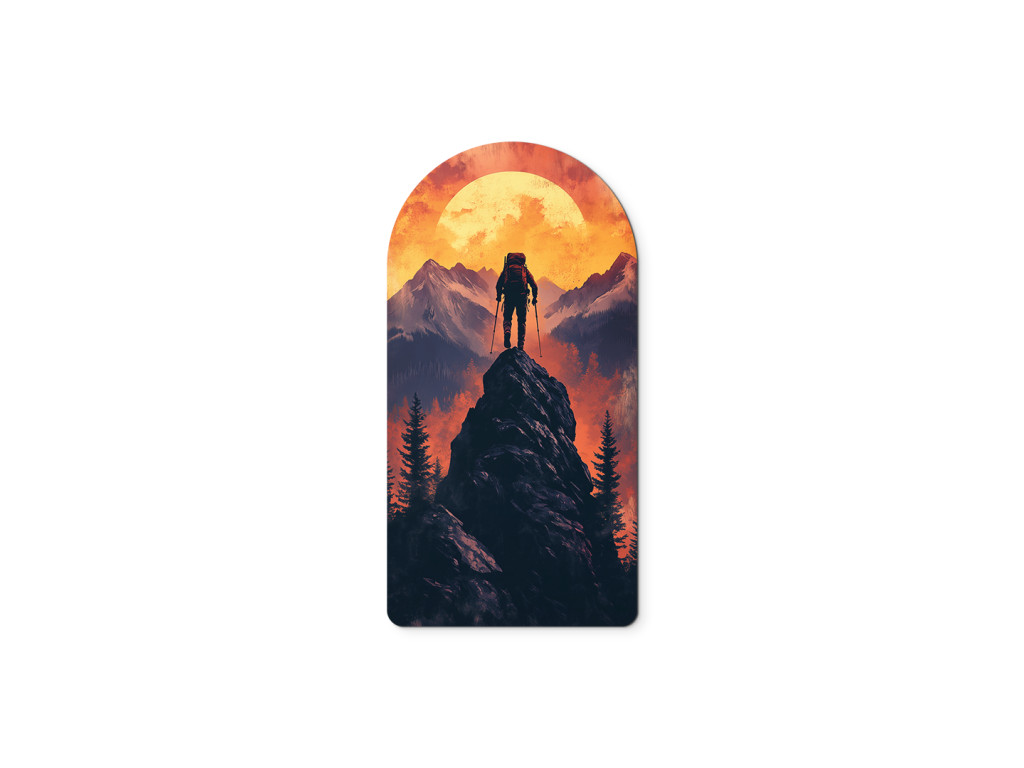 L'image représente la silhouette d'un randonneur au sommet d'une montagne au coucher du soleil. Le personnage, muni d'un sac à dos et de bâtons, se tient face au soleil orange vif, symbolisant l'objectif, l'endurance et le sentiment de victoire. Le cadre en arc souligne l'harmonie et le caractère clos de l'instant.