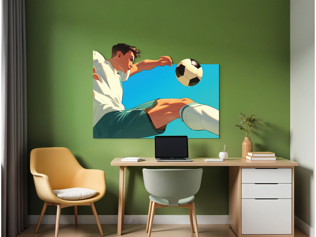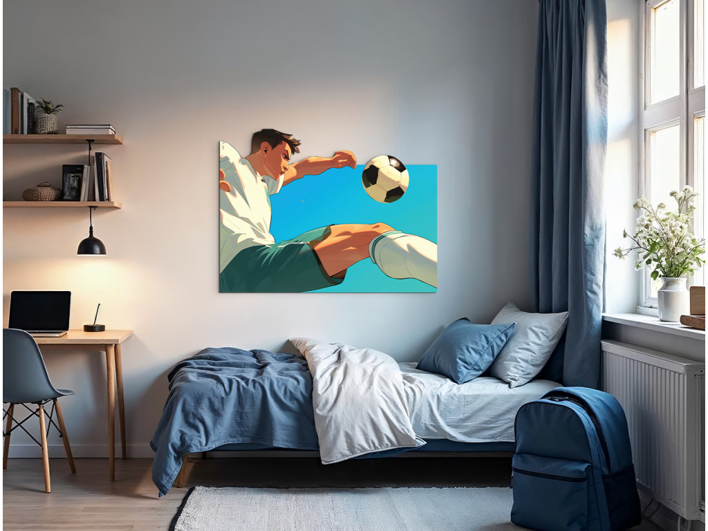 Le tableau représente un footballeur stylisé en action lors d'un coup de pied en ciseaux, avec des couleurs vives et des lignes dynamiques qui soulignent le mouvement et l'énergie. Il est idéal pour un jeune sportif ou un fan de football.