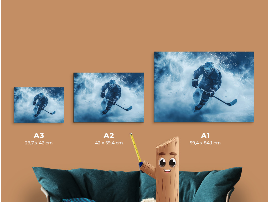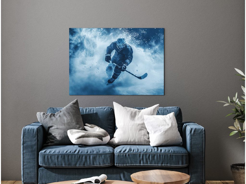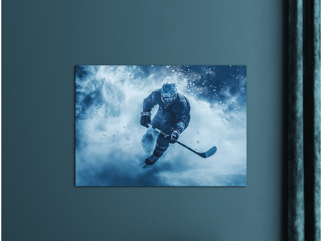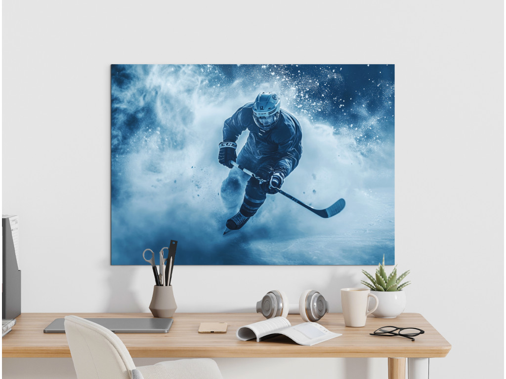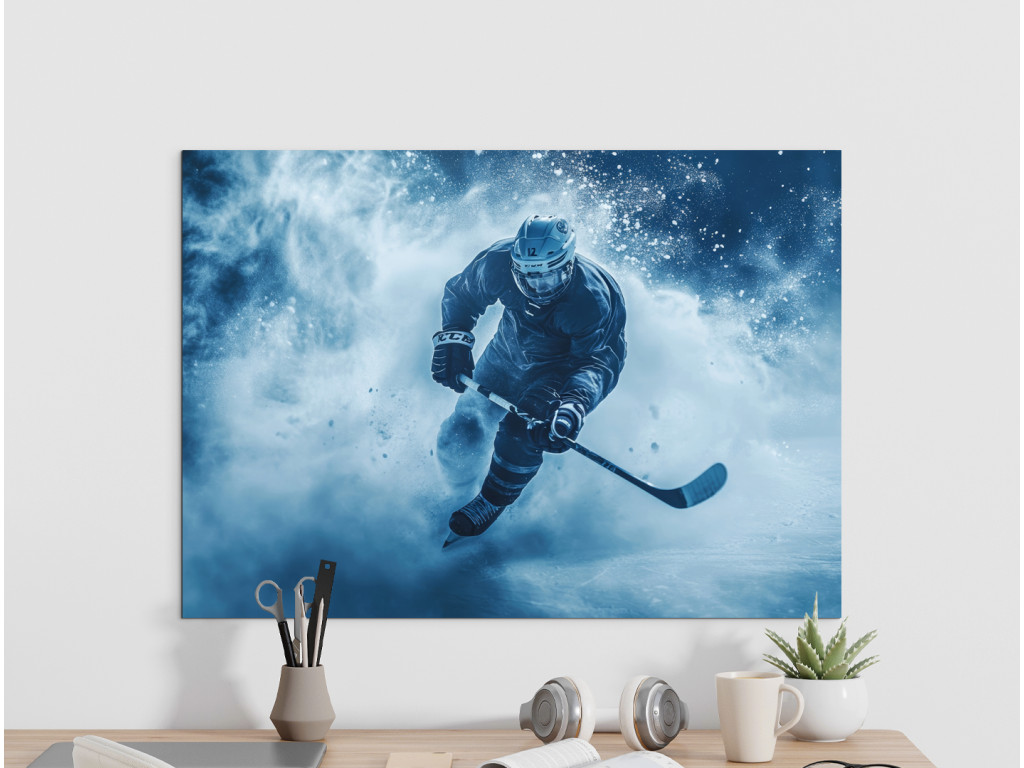 Le tableau moderne représente un joueur de hockey dynamique en pleine action, se déplaçant rapidement sur la glace avec sa crosse et son palet, tandis que la poussière de glace tourbillonne autour de lui, renforçant la sensation de vitesse et d'intensité.