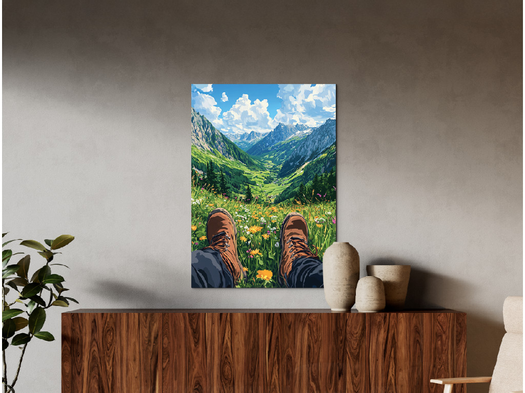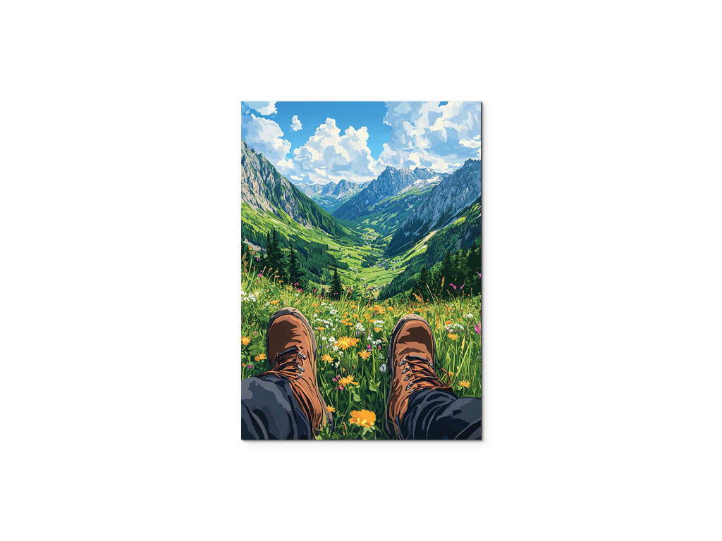 L'image capture le regard d'une personne : ses pieds chaussés de chaussures de randonnée reposent sur une prairie en fleurs. Devant le spectateur s'ouvre une vue sur une vaste vallée montagneuse baignée de lumière. La composition évoque un sentiment de paix, de liberté et de connexion avec la nature.