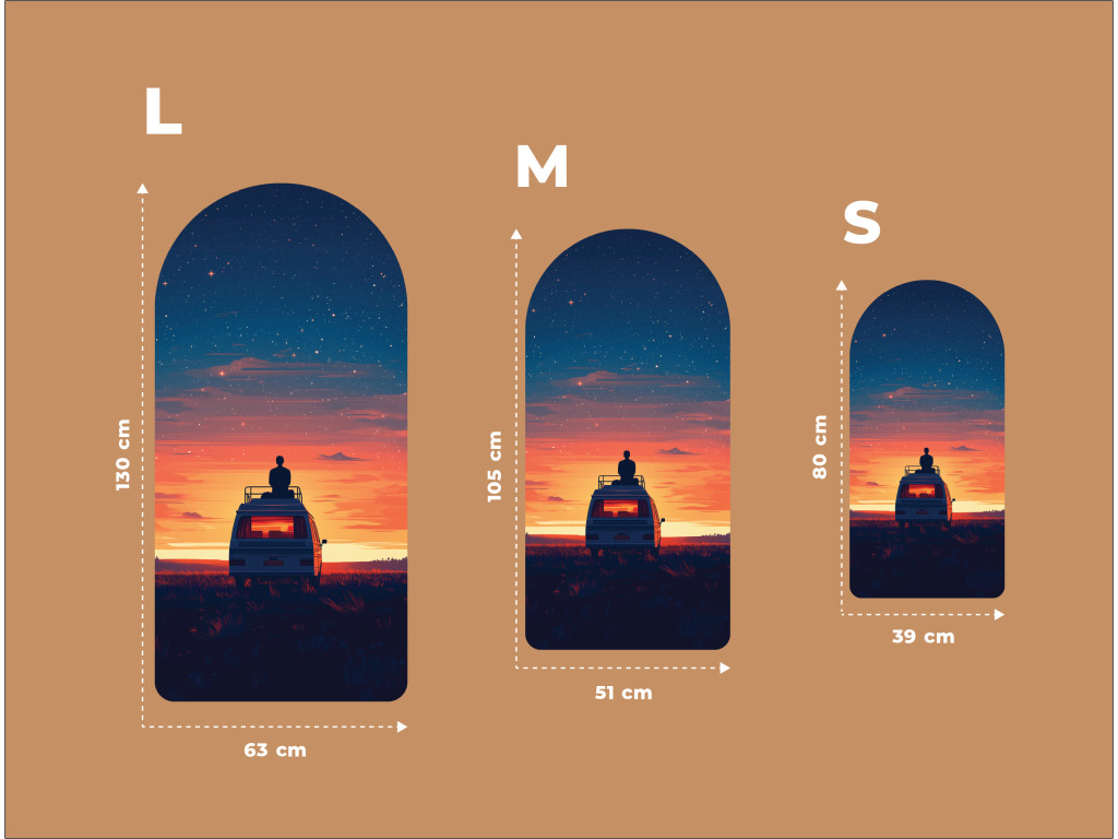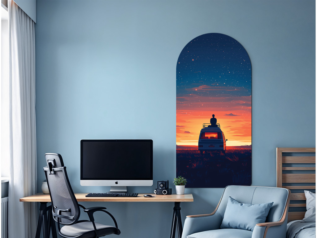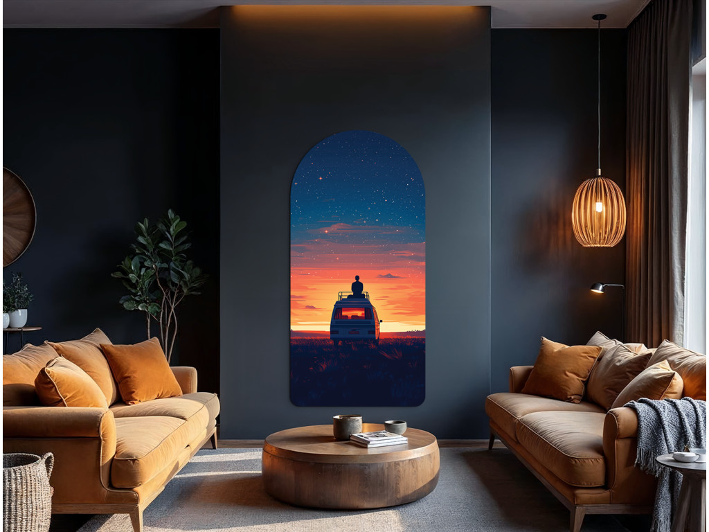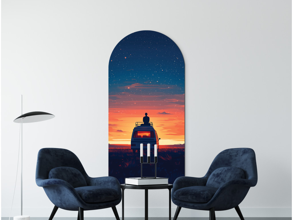 Le tableau Sous les étoiles est une décoration délicate qui procure une sensation agréable à celui qui le contemple. Une personne est assise sur le toit d'une camionnette et observe le coucher de soleil sous un ciel étoilé, ce qui crée un sentiment de paix et de connexion avec la nature.