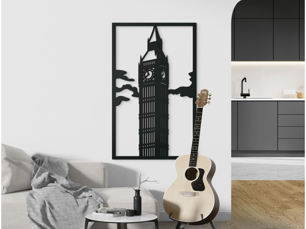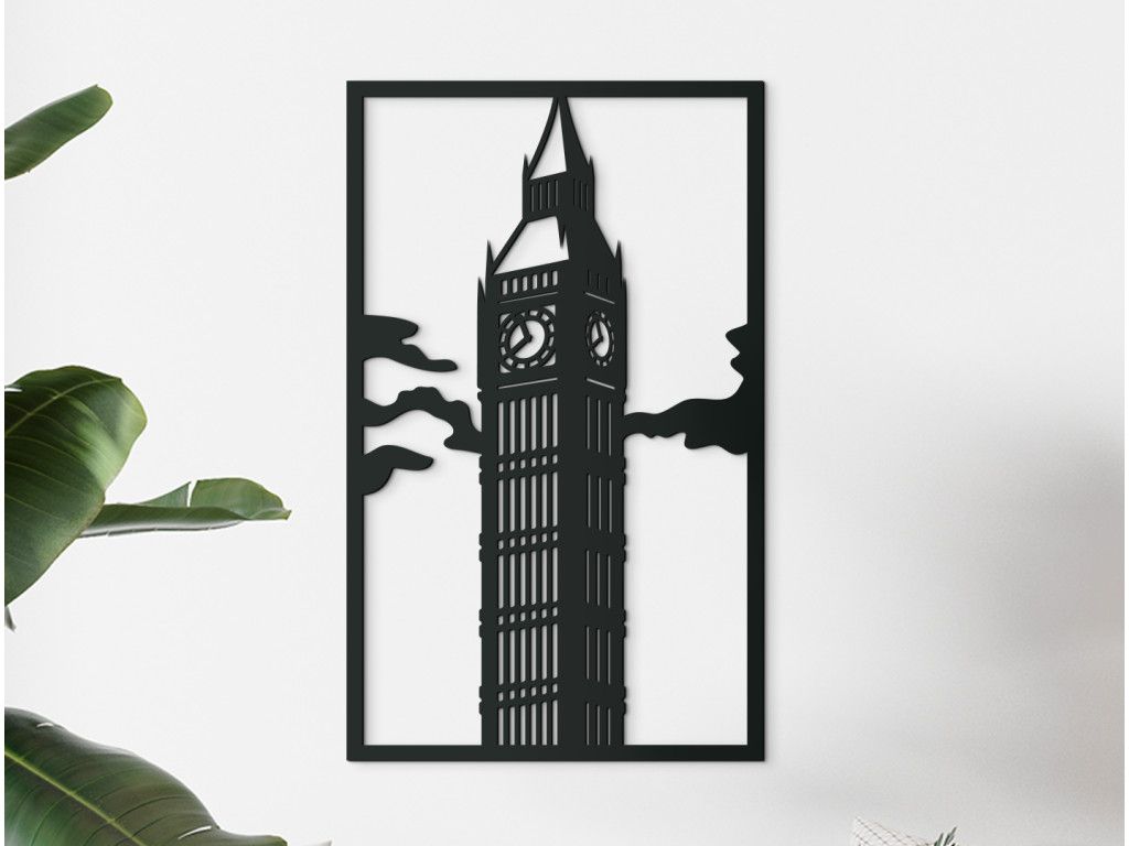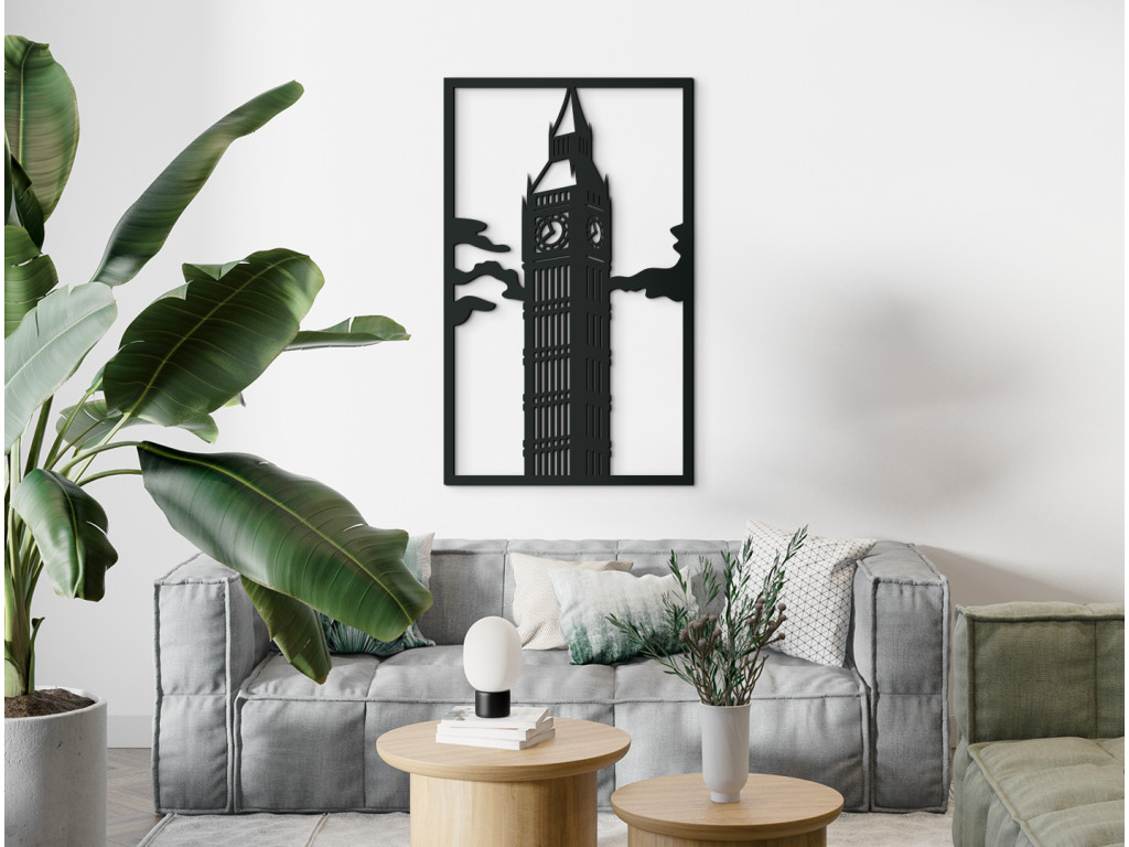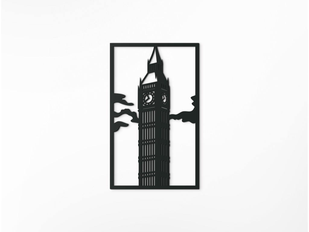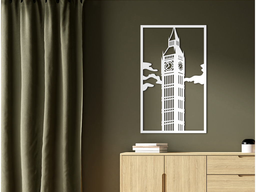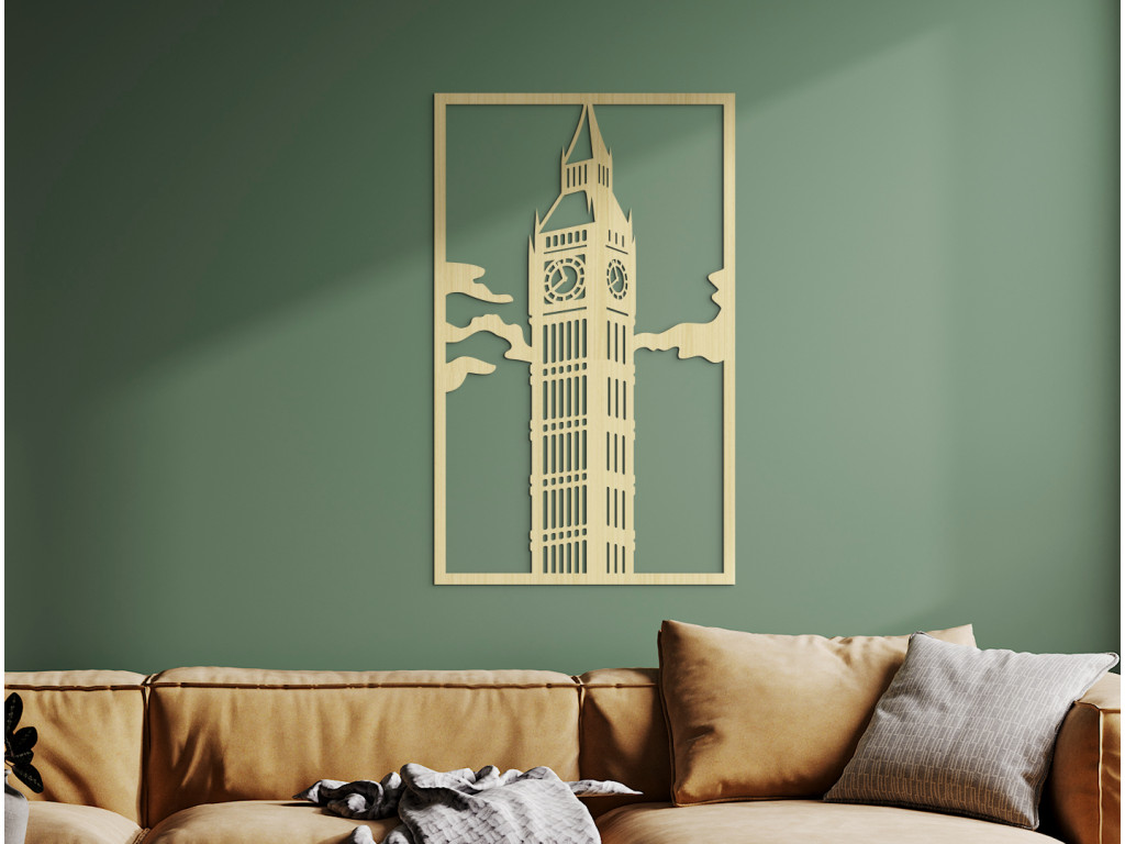 Clock Tower, od roku 2012 Elizabeth Tower či hovorovo od nepamäti Big Ben. Tak prezývame neogotickú vežu vysokú 96 metrov na severovýchode Westminsterského paláca, sídla britského parlamentu. Big Ben je však meno jej zvona, ktorý váži takmer 14 ton a svojím viac než 200 kilogramovým srdcom hlasno oznamuje Londýnu každú celú hodinu s presnosťou sekundy. Zaujímavosťou je, že do zvonice k nemu vedie až 334 schodov. Náš drevený obraz Big Ben zobrazuje Elizabeth Tower v oblakoch z bočného pohľadu tak, aby ste mali výhľad na dva zo 4 ciferníkov najväčších hodín svojej doby z roku 1858, ktoré sú umiestnené 55 m nad zemou.