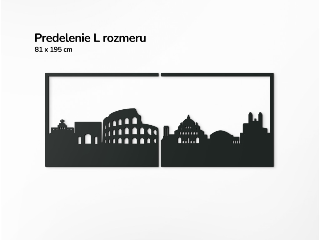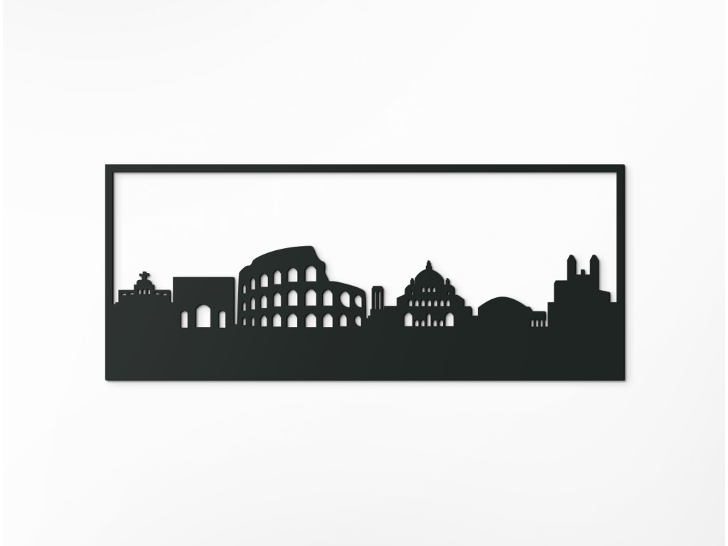 Zľava ju začína kruhový Anjelský hrad (Castel Sant'Angelo) pýšiaci sa spolu s mostom nad riekou Tiber a mramorový Konštantínov víťazný oblúk (Arco di Constantino) s tromi oblúkovými priechodmi. V jeho blízkosti, rovnako ako v skutočnosti, sa nachádza známy amfiteáter Koloseum (Colosseo). Architektonická dominanta bola najväčšou budovou Rímskej ríše a napriek tomu, že v súčasnosti ju tvoria už len ruiny, nejednému návštevníkom svojou veľkoleposťou ešte stále navodí zimomriavky po celom tele. Obraz pokračuje siluetou stĺpov a pozostatkov budov z antiky z Forum Romanum. Vedľa nich sme umiestnili Chrám svätého Petra (Basilica di San Pietro) s Michelangelovou kupolou vo Vatikáne na rovnomennom námestí, ktorá je centrom katolíckeho kresťanstva a najnavštevovanejšou svätyňou na svete. Medzi skvostami Ríma nemôže chýbať ani antický kruhový Pantéon z roku 25 pred Kristom na námestí Piazza della Rotonda. Našu panorámu ukončuje Španielske námeste (Piazza di Spagna) so známymi Španielskymi schodmi a trojičným kostolom Trinità dei Monti, ktoré môžete poznať aj z mnohých filmových adaptácií.